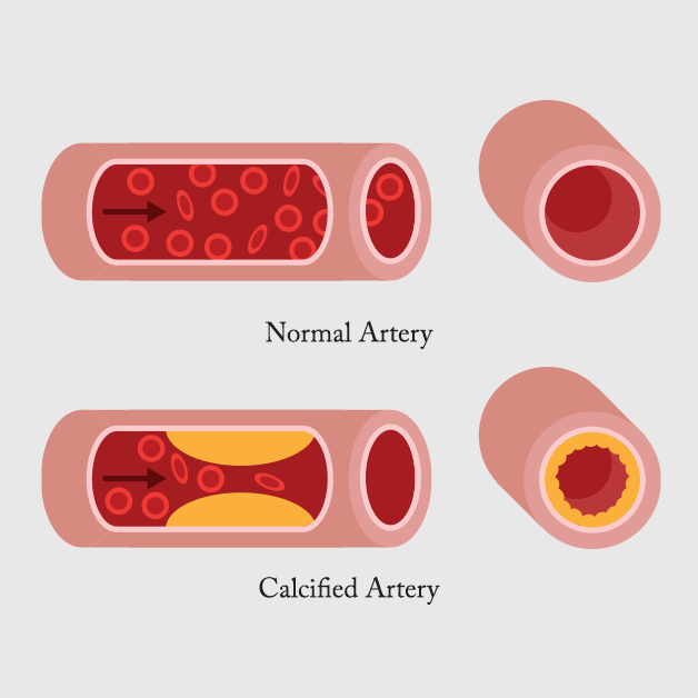 Calcium, in the form of fatty deposits, can build up in your arteries over time, making them harder and less flexible. Calcification in the arteries may increase the risk of heart disease, which is referred to as “the silent killer". The situation is worse if you have high blood pressure or high cholesterol.