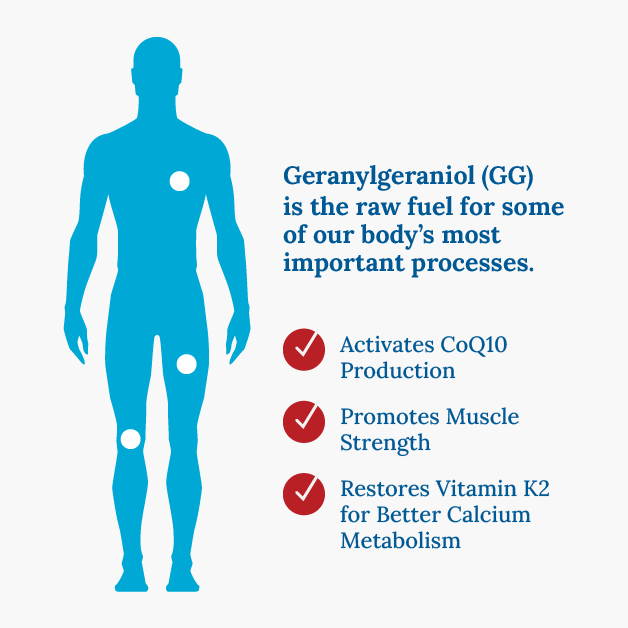 Geranylgeraniol (GG) is the raw fuel for some of the most important biological processes. It’s a critical component of the mevalonate metabolic pathway, which is responsible for cholesterol production, CoQ10 production, muscle protein synthesis and bone health.